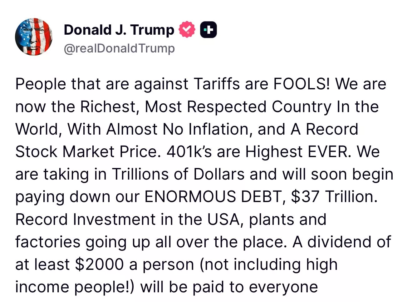 川普周一在社交平台Truth Social上发文,表示关税正为美国带来丰厚回报:“我们正在吸纳数万亿美元,并很快将偿还高额债务。每个人都将被支付2000美元的红利(高收入人群除外!)。”