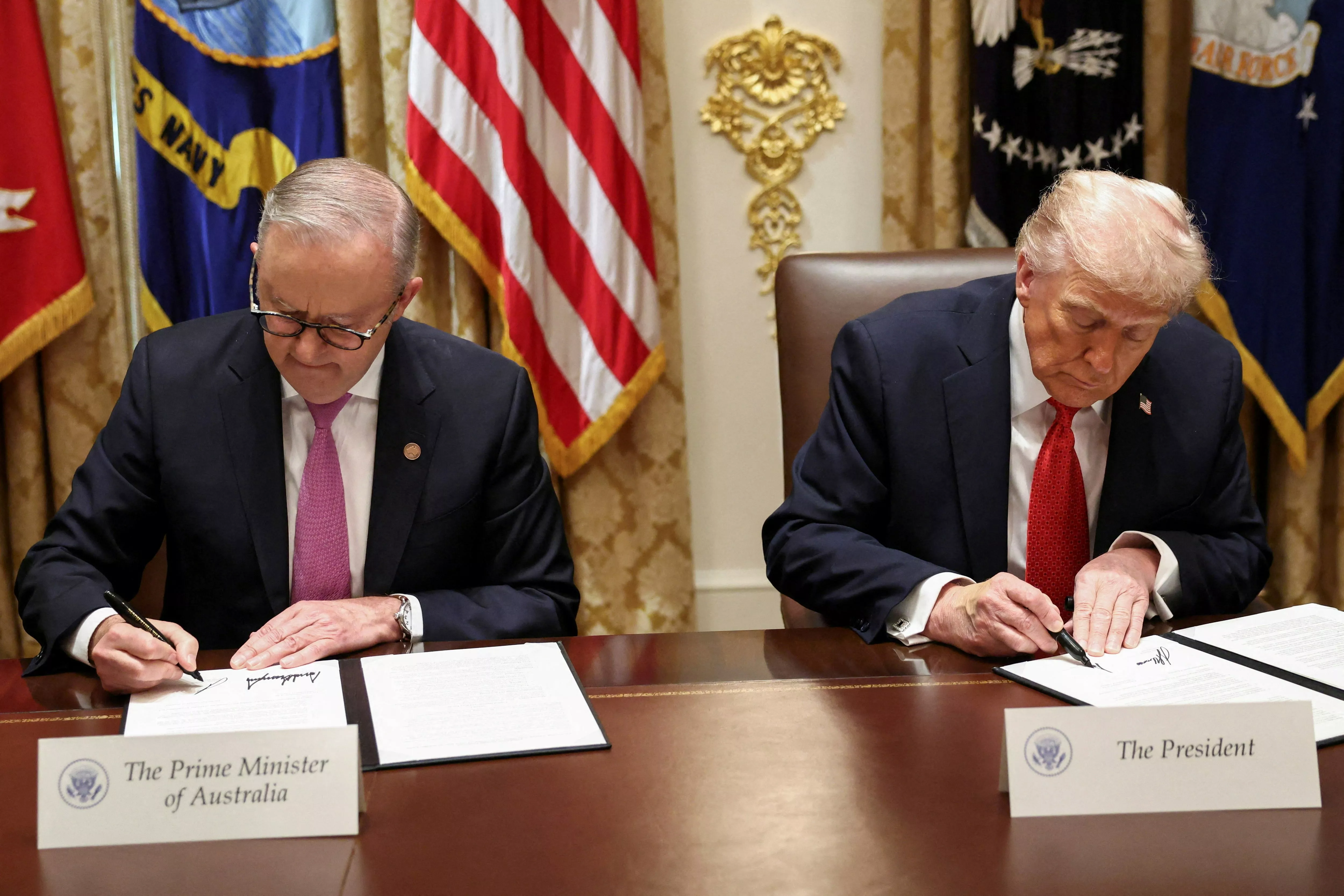 2025年10月20日,美国总统川普(Donald Trump)在白宫会见澳洲总理阿尔巴尼斯(Anthony Albanese),双方签署关于稀土和关键矿产的协议。(Reuters)