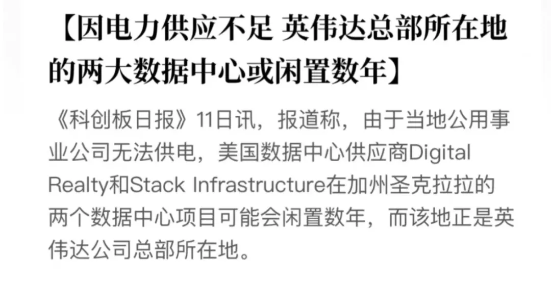 而英伟达总部所在地的两大数据中心,也因电力供应不足可能将闲置数年。