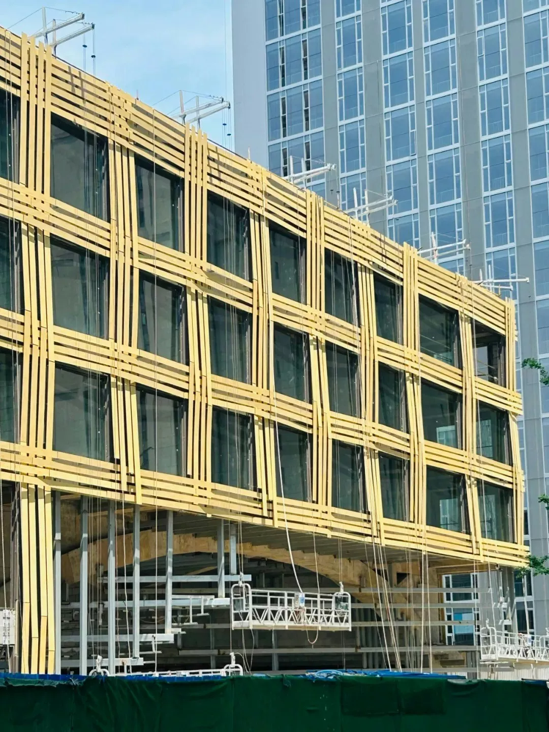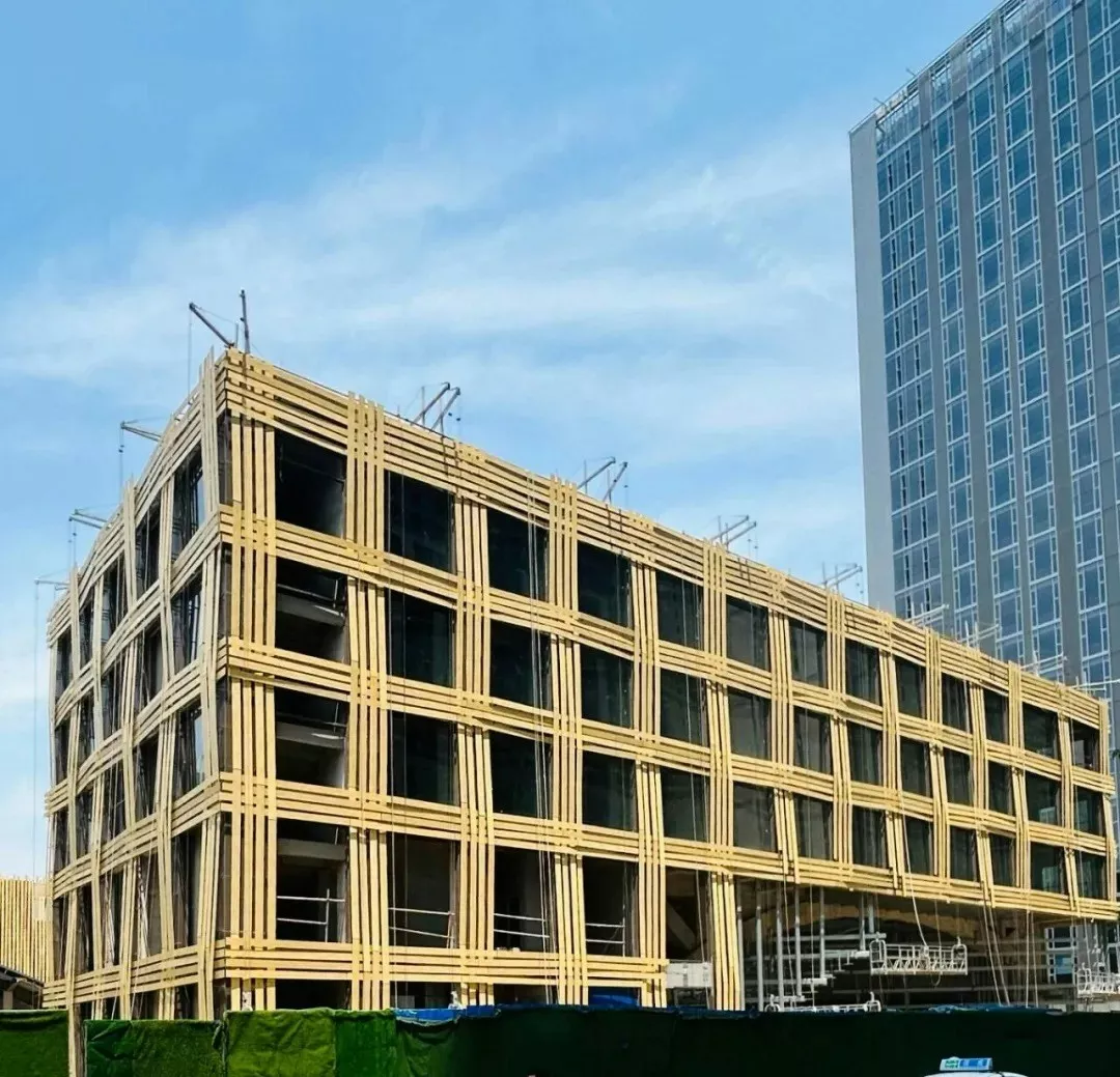 目前酒店还在施工中,远远看去,外牆上一道道裸露的木条和铝板纵横交错,确实神似打包大件快递时用的防护木架。走近一点,还能看到一些铝板接口处有点粗糙,整体还处于“半成品”状态。