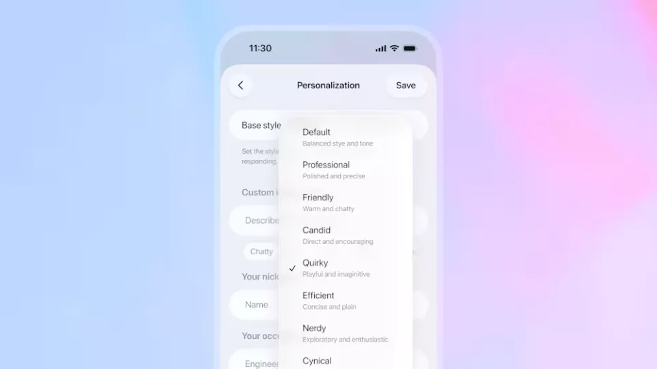OpenAI对预设对话风格进行了优化。在保留并优化"默认"、"友好"(原"倾听者")和"高效"(原"机器人")的基础上,新增"专业"、"直言不讳"和"古怪"三种风格。结合原有的"愤世嫉俗"和"书呆子气",用户现在可以从八大个性选项中选择最契合自己需求的对话风格。