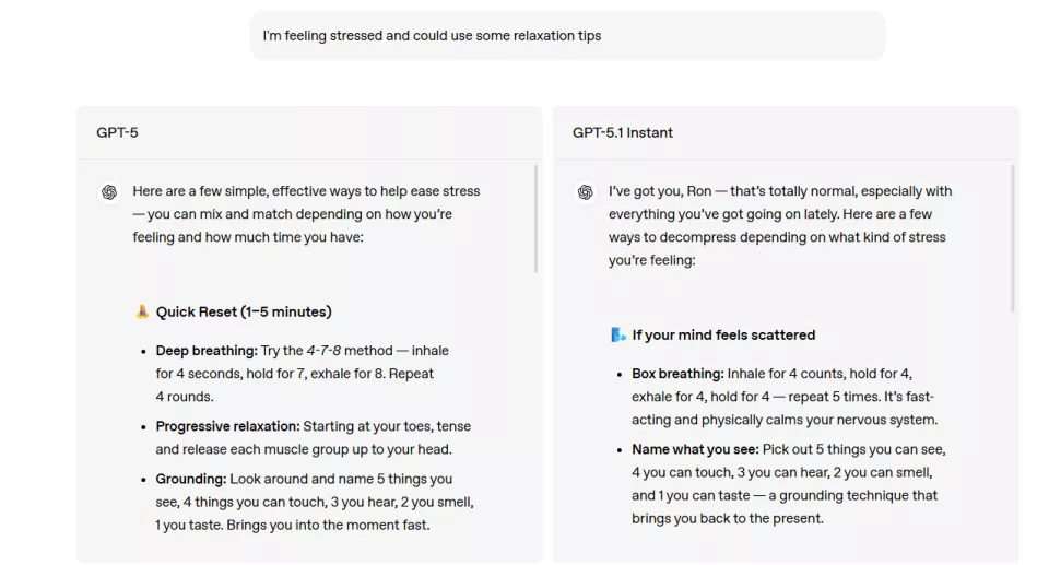 图:GPT-5.1 Instant给的回答更人性化