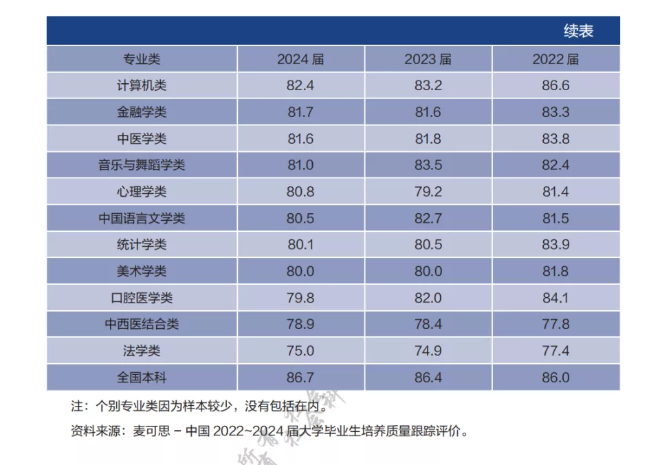 类似的困境并非个例。麦可思研究院《2025年中国本科生就业报告》中关于“2022-2024届本科主要专业类毕业生毕业半年后的去向落实率”的统计显示,2024届计算机类毕业生去向落实率仅有82.4%,在61个主要专业类中排名倒数第十一,显著低于全国本科平均水平的86.7%。