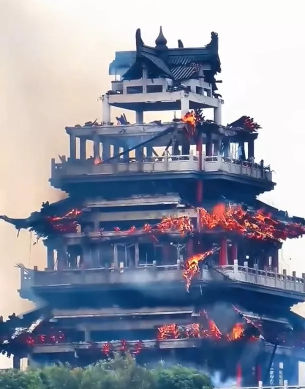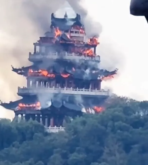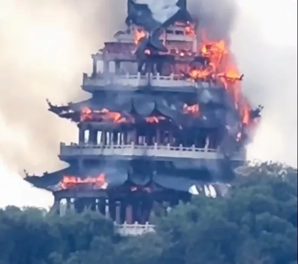 据官方最新通报,该栋建筑为永庆寺内的文昌阁,是2008年所建的仿古建筑,採用钢筋混泥土框架,高度23米,2009年10月建成后,委託临近永庆寺管理,阁内未收藏文物。
