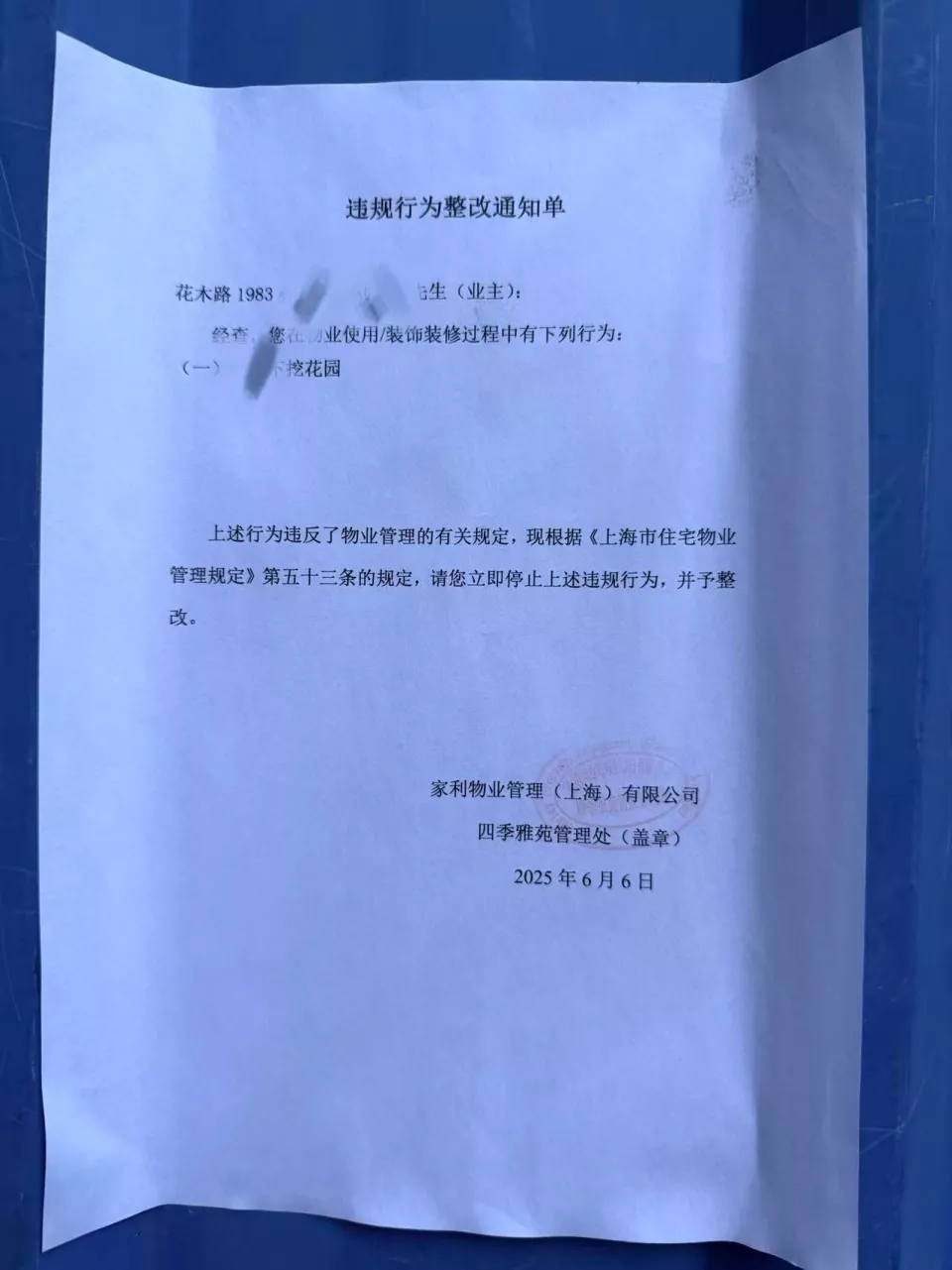 而后,物业当场开具违规行为整改通知单,并写明:“您在物业使用/装饰装修过程中有下挖花园的行为,违反了物业管理的有关规定,现根据《上海市住宅物业管理规定》第五十三条的规定,请您立即停止上述违规行为,并予以整改。”