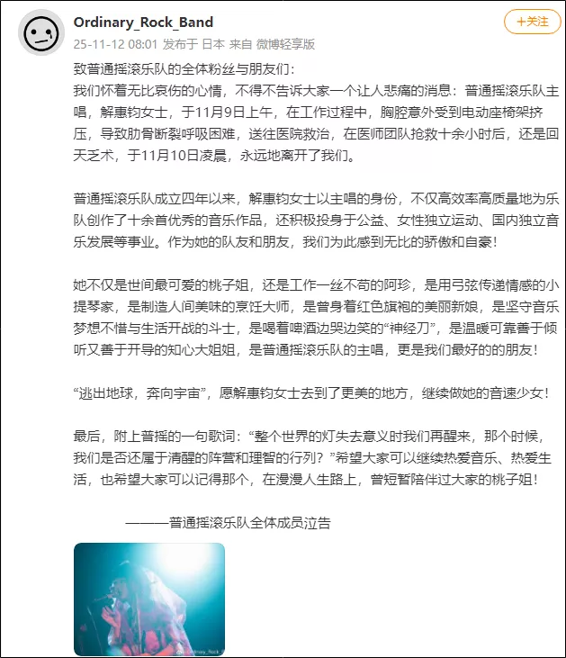 11月12日,普通摇滚乐队@Ordinary_Rock_Band 发布了正式讣告,乐队主唱解惠钧(艺名阿珍)9日上午在工作过程中,胸腔意外受到电动座椅架挤压,导致肋骨断裂呼吸困难,送医抢救十余小时后回天乏术,于10日凌晨去世。解惠钧为普通摇滚乐队的核心成员,在担任主唱外,也为乐队创作十余首优秀的音乐作品。