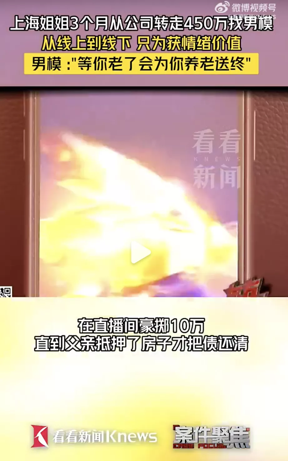 挪用450万公款的周某,也曾迷上短视频和直播间,在男主播一声声“姐姐”中,豪掷10万元,最终靠父亲抵押房子才把债还清。