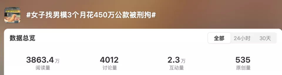 无独有偶,今年2月,43岁的周某因“找男模3个月花450万公款”的话题也登上热搜。