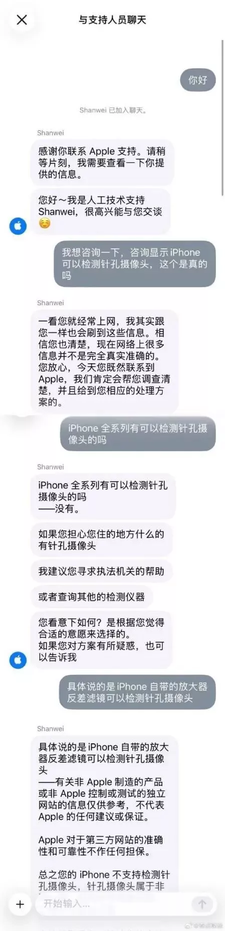 按照Apple技术支持人员的解答,iPhone全系列不可以检测针孔摄像头,有关非Apple控制或测试的独立网站信息仅供参考,不代表Apple的任何建议或保证,总之iPhone不支持检测针孔摄像头。