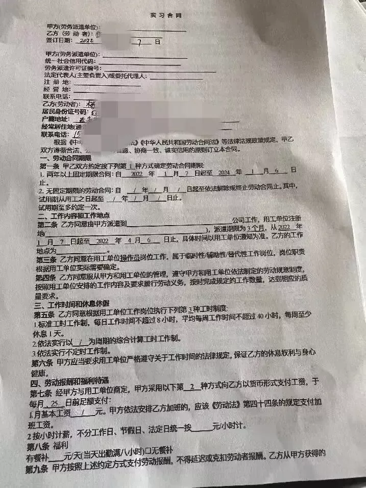 陈庆峰也害怕,想着自己别受伤,去医院看病还要花钱。同在昆明的一所职业学院,在2022年发生过更严重的事。据法治日报报道,护理专业的杨林与100多名同学一起,到江西南昌的工厂实习。因连续夜班且工作超12小时,身体不适多次请假,但工厂以冲刺产量为由不批准,最终年仅17岁的杨林因呼吸衰竭死亡。