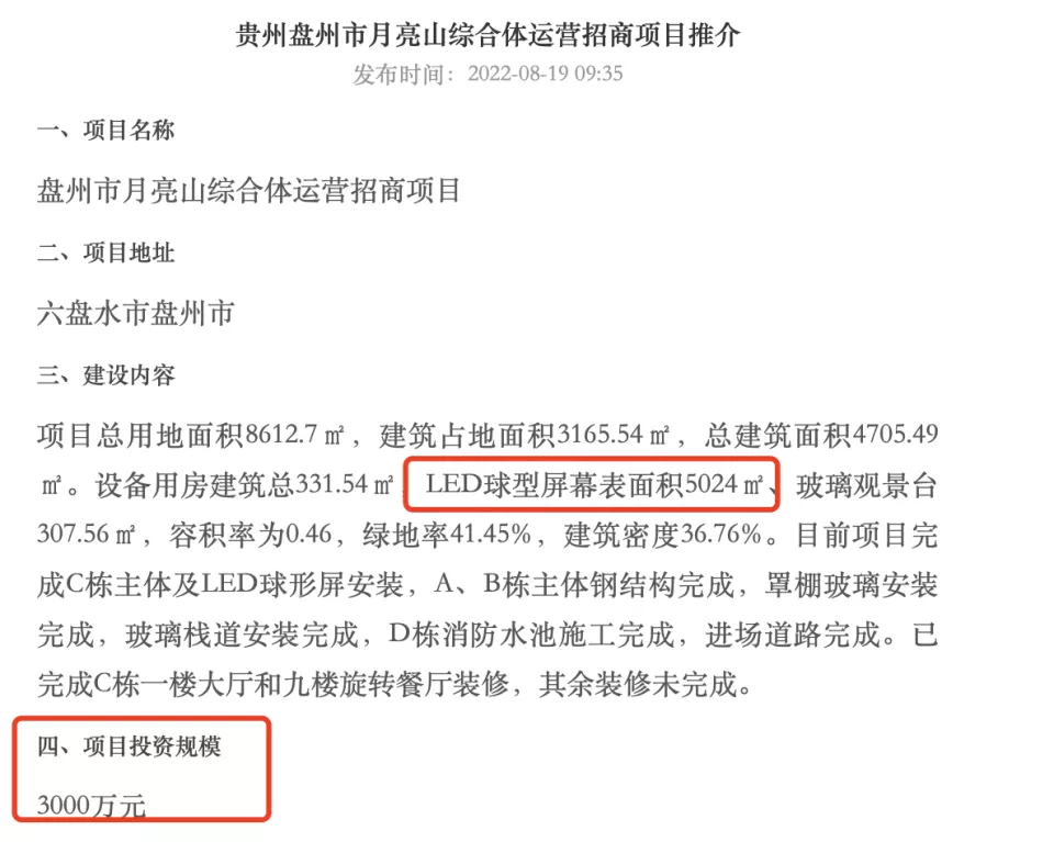 如2022年8月公开的“盘州市月亮山综合体运营招商项目推介”的招商信息显示,彼时月亮山综合体除LED球形屏、玻璃栈道、1楼大厅和9楼旋转餐厅完成装修外,其余部分仍未完工。而这份招商项目的投资规模也高达3000万元。到2024年8月,“盘州旅游”再次就该项目发布招商公告,此次招商面积达4354㎡,招商范围包括观景台旋转餐厅、LED球形显示屏等。