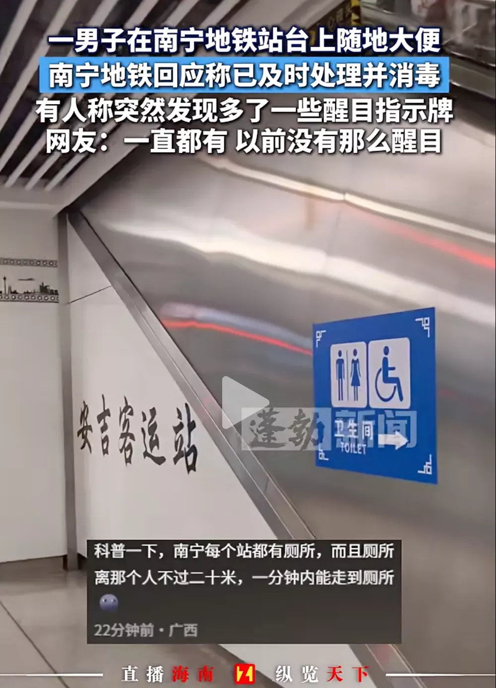 因为据媒体报道,当这位靓仔在地铁干完这一泡操作后,有人表示突然发现南宁地铁里多了很多醒目的厕所指示牌: