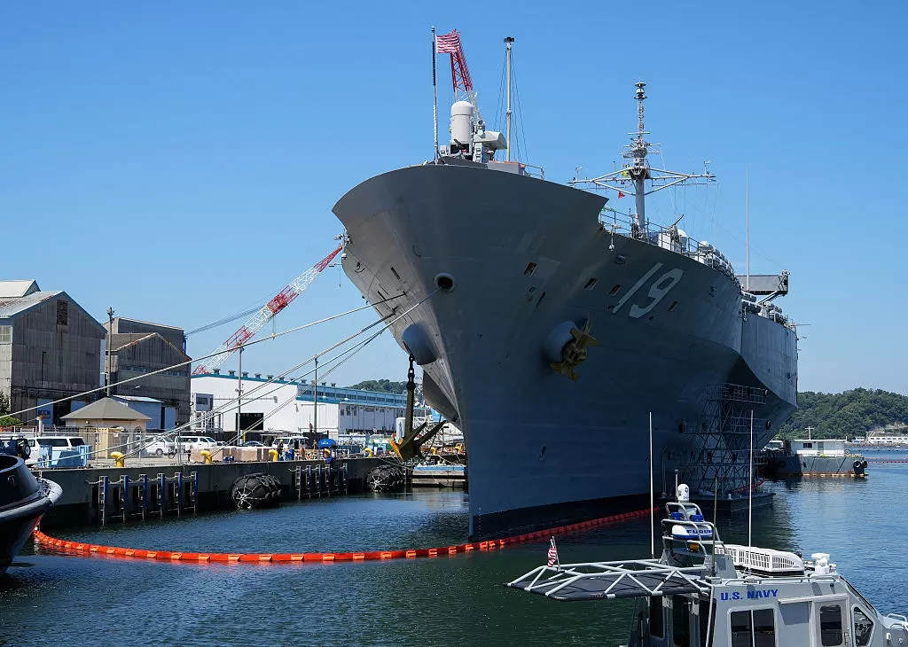 2025年8月19日,日本横须贺,美国海军蓝岭号两栖指挥舰(USS Blue Ridge)停泊在横须贺海军基地。(Getty)