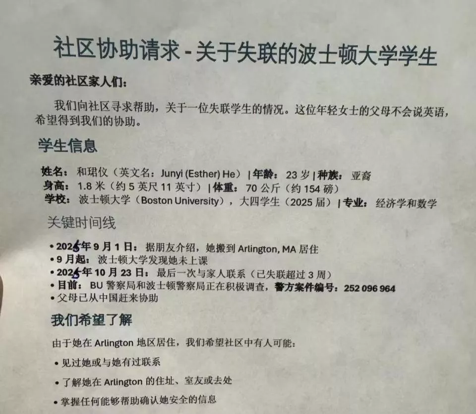 据寻人启事,23岁亚裔女性和珺仪为波士顿大学学生,专业为经济学和数学,身高1米8,体重70公斤。2025年9月1日,据朋友介绍,和珺仪搬到马萨诸塞州的阿灵顿居住。9月起,波士顿大学发现她未到校上课,10月23日为她与家人的最后一次联系,目前已失联超3周。BU警察局和波士顿警察局正在积极调查。和珺仪的父母已从中国赶至美国。