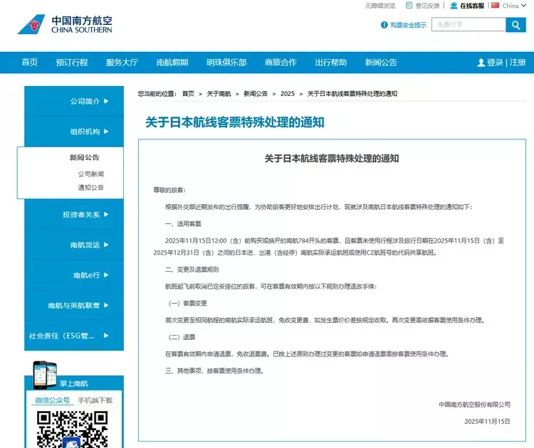 南航在通知中明确,对于在今年11月15日12:00(含)前购买或换开的南航784开头的客票,且客票未使用行程涉及旅行日期在2025年11月15日(含)至2025年12月31日(含)之间的日本进、出港(含经停)南航实际承运航班或使用CZ航班号的代码共享航班,航班起飞前取消已定妥座位的旅客,在客票有效期内申请退票,免收退票费。首次变更至相同航程的南航实际承运航班,免收变更费,如发生票价价差按规定收取。