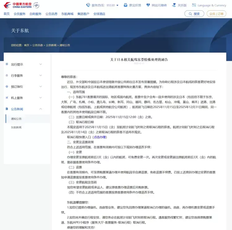 东航在通知中明确,对于在今年11月15日12:00(含)前购买或换开的东航781客票填开的国际、地区或国内航班。客票中至少含有一段未使用的涉及日本(包括但不限于东京、大阪、广岛、札幌、小松、鹿儿岛、长崎、新泻、冈山、福冈、静冈、名古屋、松山、冲绳、富山、熊本)进港、出港或经停航班(包括东航、上航或其他航空公司航班),航班起飞日期在2025年11月15日至2025年12月31日期间,同一客票内的其他未使用航段日期不限。办理变更至原航班前后3天(含)以内的航班,可免费变更一次。再次变更或变更超出原航班前后3天(含)内的航班,需依据客票使用条件办理。在客票有效期内,可至原购票渠道办理未使用航段非自愿退票,免收退票手续费。