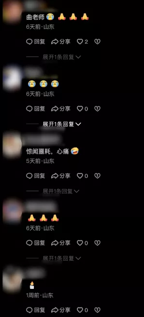 曲先生向记者提供了姐姐的社交账号,在11月6日的视频下面,不少网友还有学生、朋友、同学发布评论表示悼念惋惜。曲先生说,在姐姐的葬礼上来了不少学生,他们都哭得挺伤心,他们说平常班里搞活动,老师都会给他们买零食,对学生就像对自己的孩子一样,学校发的饭卡她自己都不用的,都给一些家庭困难的学生用。