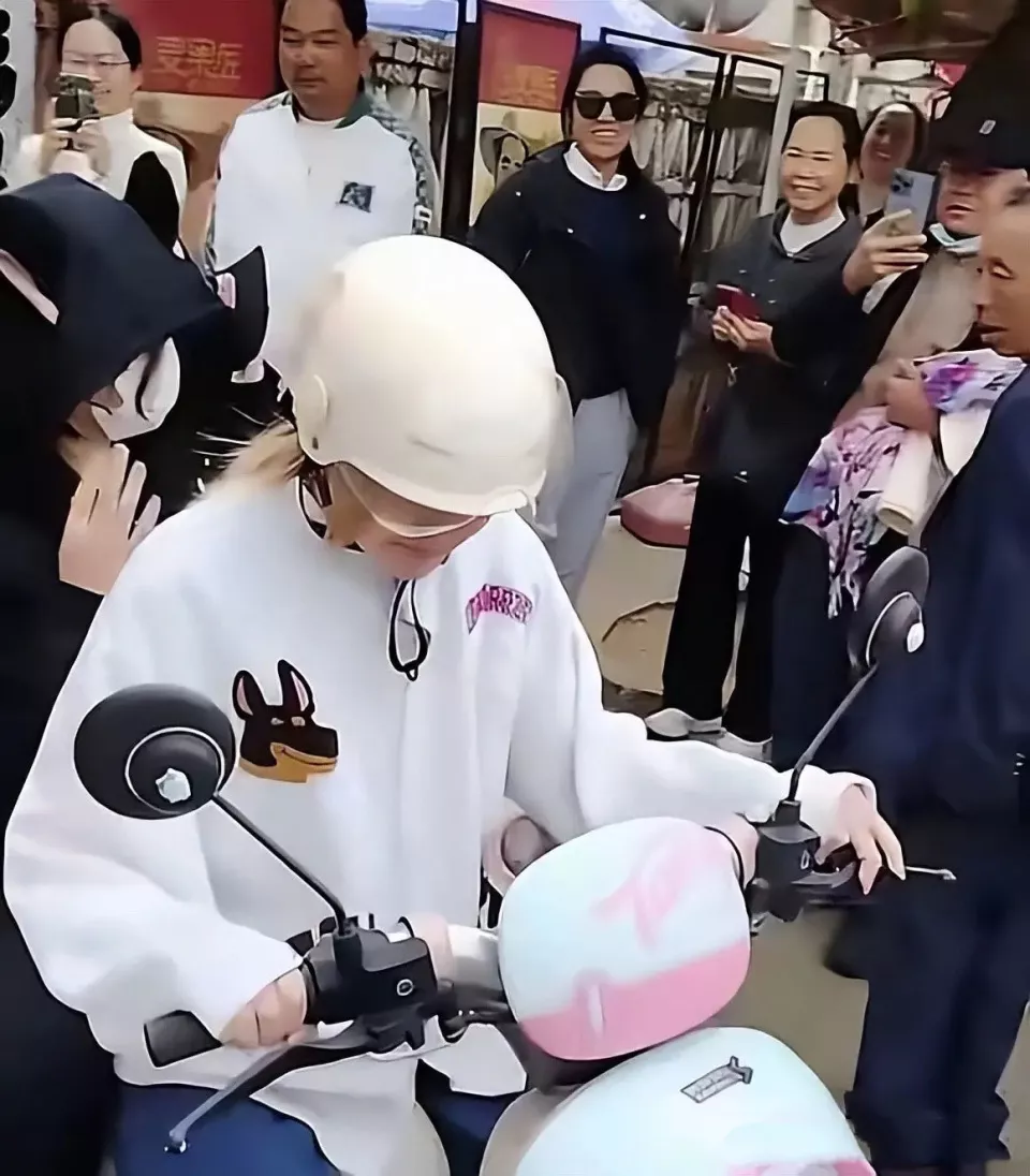 全红婵的妹妹穿了一件宽松的白色卫衣、牛仔裤,她染了金黄色的头发、看起来洋气了许多。因为有太多人围观,妹妹戴着头盔、低着头,并不想回应,她看起来有点害羞。