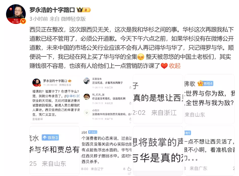 26日上午,他更是把狠话放到底:“今天下午六点前,华杉不公开道歉,未来中国市场公关行业,没人会记得华与华,只会记得‘罗与华’!”
