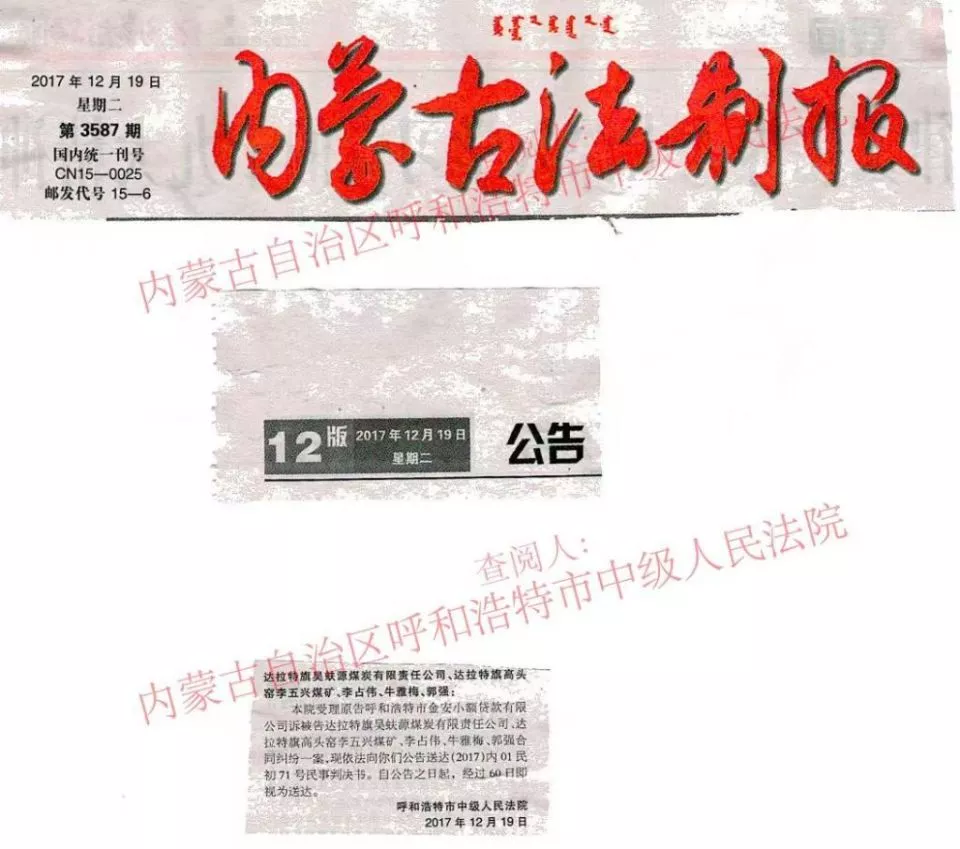 2017年8月11日,针对5000万元的循环贷款纠纷,同样在李五兴煤矿未到场的情况下,呼市中院缺席审理,作出(2017)内01民初71号民事判决书,判决包括李五兴煤矿在内的五名被告共同偿还本息3993万余元。