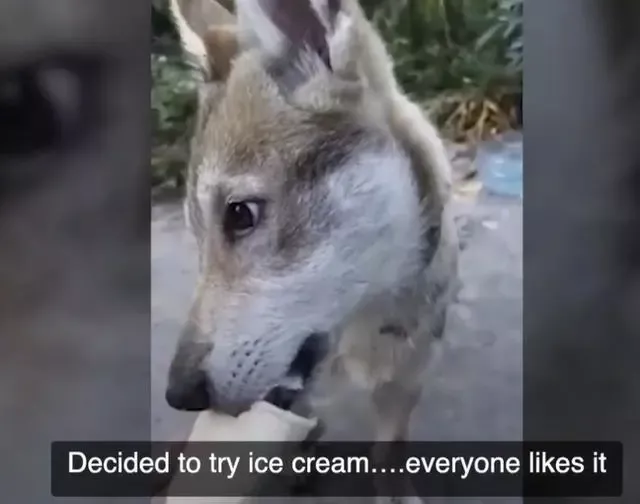 从发布的视频可以看到,其中的一匹名为维索塔 (Vysota)的小母狼正在吃冰淇凌,那种听话温顺的感觉,和大型宠物犬有些相似,但它们的确是狼。