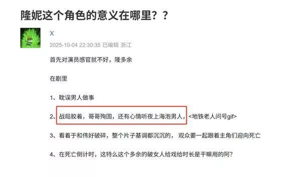 聊完了那些演技炸裂的演员,咱得聊聊这部剧里的“负分担当”,隆妮!