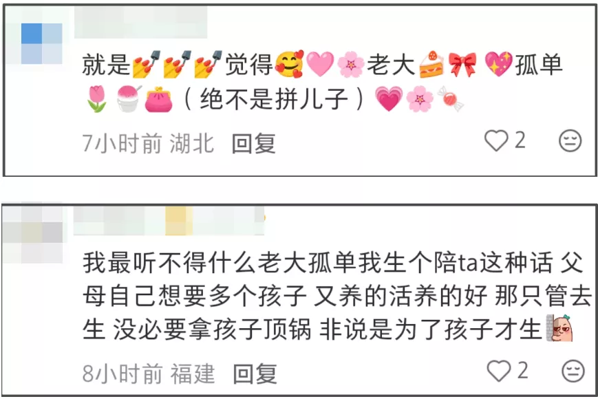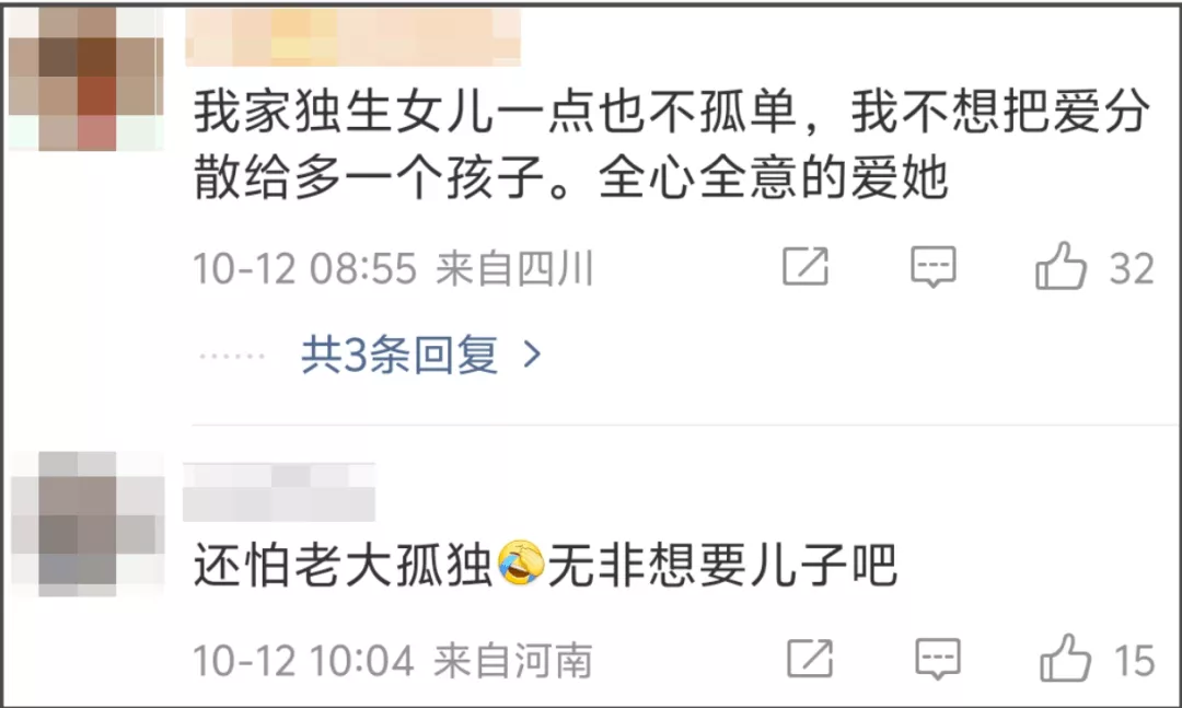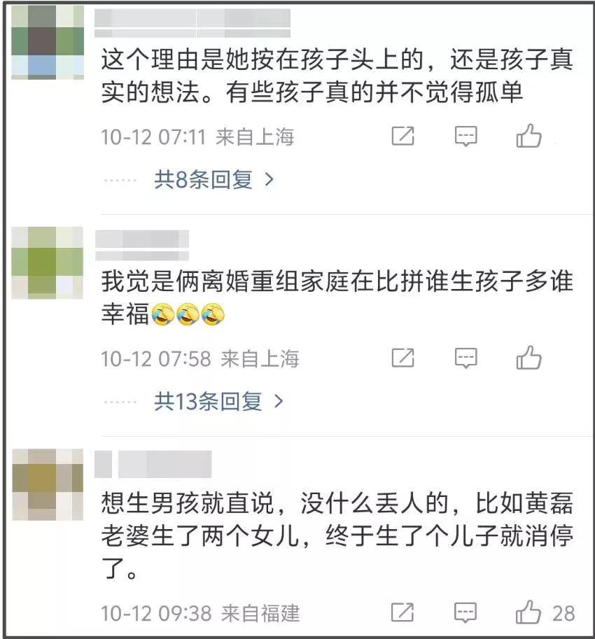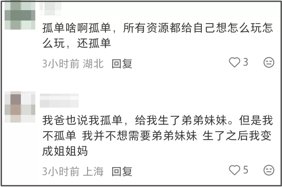 有人从母亲角度出发,直言能给女儿最大的礼物就是没有手足,可以给她全心全意的爱和家产;有人从孩子角度出发,觉得所谓一胎孤独的想法是父母灌输,家中有父母外出有朋友,作为星二代未来有资源,到底为什么会孤独?