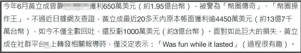 不管怎么算,都是很大一笔钱呀,报道一出,黄立成本人通过社媒做出回应,他说:“Was fun while it lasted”,意思是过程很有趣,看着挺淡定的,只是网友想法不同。