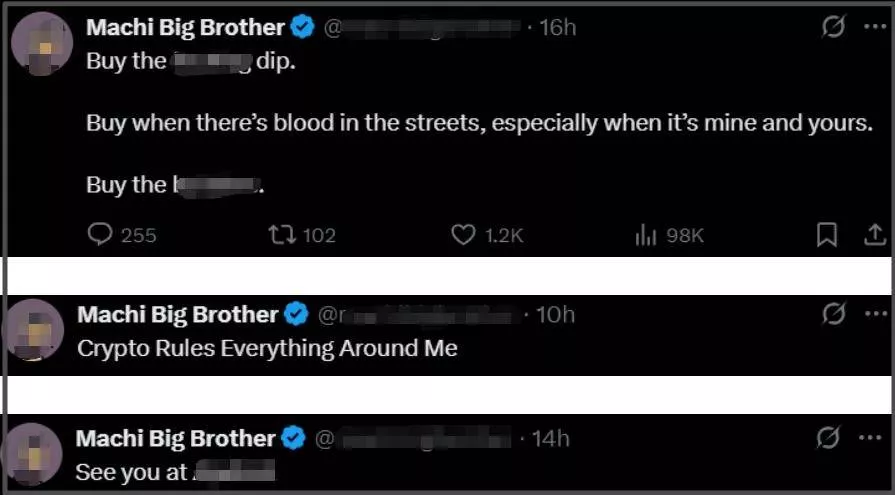 从黄立成的表现看,他似乎隐隐约约有了危机感,赔掉3.8亿回应表示过程有趣之后,他又接连更新多条社媒,一边表示越是血流成河越要投资入场,一边感慨“Crypto Rules Everything Around Me”。