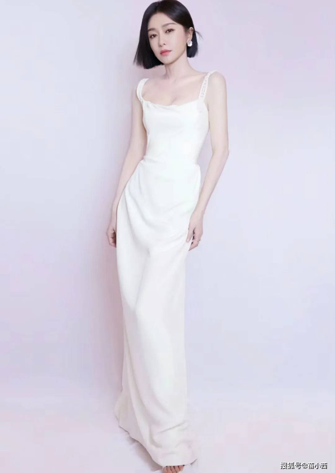 再看这条白色吊带连衣裙,裙子采用经典的方领设计,恰到好处地展现出秦岚精致的锁骨和优美的肩颈线条,不会过于暴露,又能增添一丝小性感。方领在视觉上还能横向拉伸肩部线条,让肩部看起来更加平直,从而营造出一种端庄大气的感觉。吊带的设计也颇为讲究,适度的宽度保证了穿着的舒适度,还能很好地分担裙子的重量,避免走光等尴尬情况。