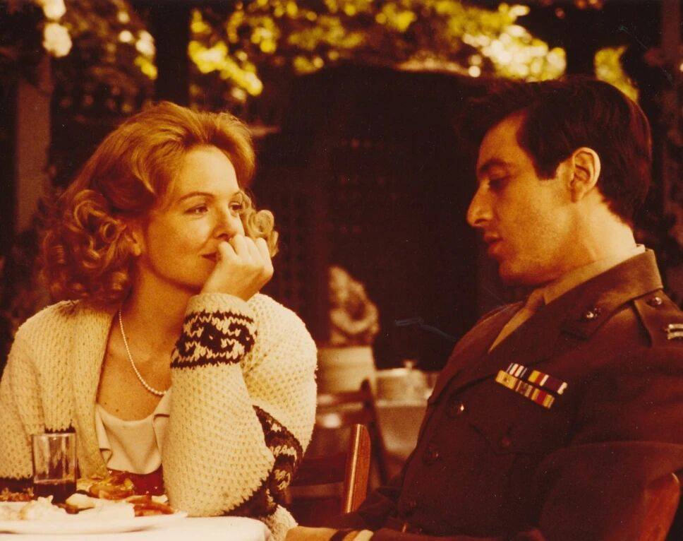 在《教父》三部曲中,戴安·基顿饰演凯·亚当斯,以温柔坚韧的形象为黑帮史诗注入人性温度,结局隔门凝望的无声表演被誉为影史经典。