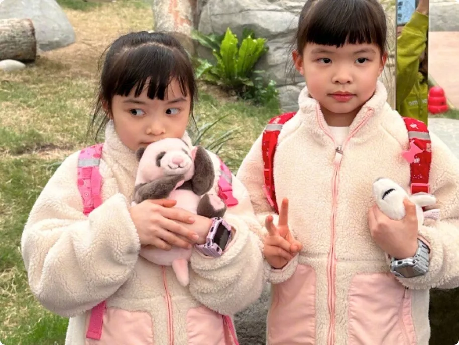 她们的眼睛也是一大亮点,形状略长,眼尾自然上挑,和郭可颂的凤眼几乎如出一辙,笑起来的时候,那种微微眯起的神态,就是爸爸的翻版。