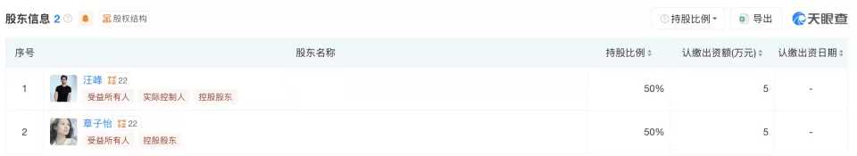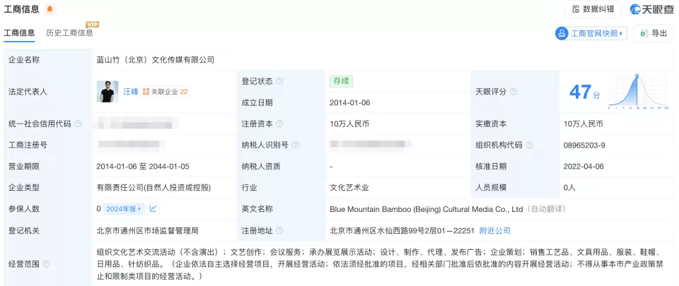 天眼查显示,目前汪峰和章子怡之间还存在着商业关联,两人共同持股【蓝山竹(北京)文化传媒有限公司】。