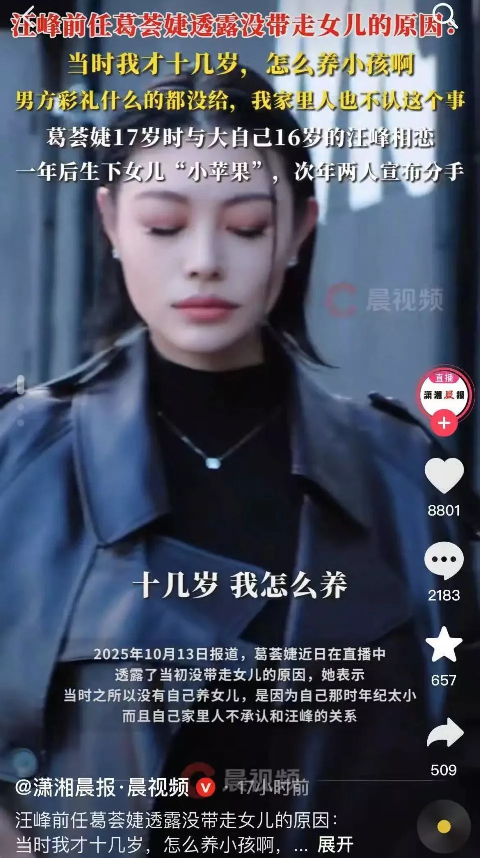 近日,汪峰的前任之一葛荟婕也再度成为焦点,她自曝18岁生下女儿,因无力抚养而交给汪峰。