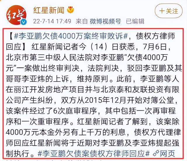 7月份,李亚鹏欠债4000万的案子败诉,他和哥哥李亚炜被强制执行,且都限制了高消费。