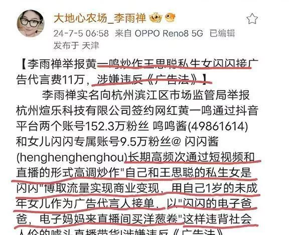 有个博主看不下去,举报了黄一鸣说他利用女儿闪闪接广告,可能违反了广告法。