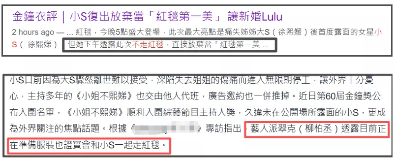 另外,不得不提的是,趁着大S离世8个月现身金钟奖,小S多多少少有点逼迫主办方给她奖项的嫌疑。