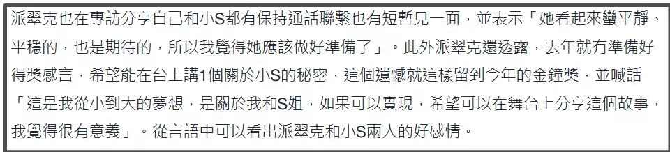 金钟奖颁奖礼开始之前,从前主持搭档蔡康永,到现搭档派翠克,话里话外都提醒外界关注小S情绪,嘴上说着她看着很平静,本质时时刻刻提醒外界小S没了姐姐。