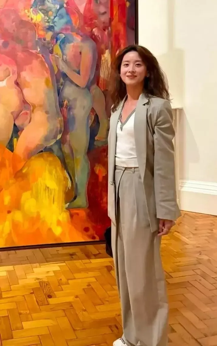 32岁章泽天伦敦看展,穿西服烫羊毛卷显老气