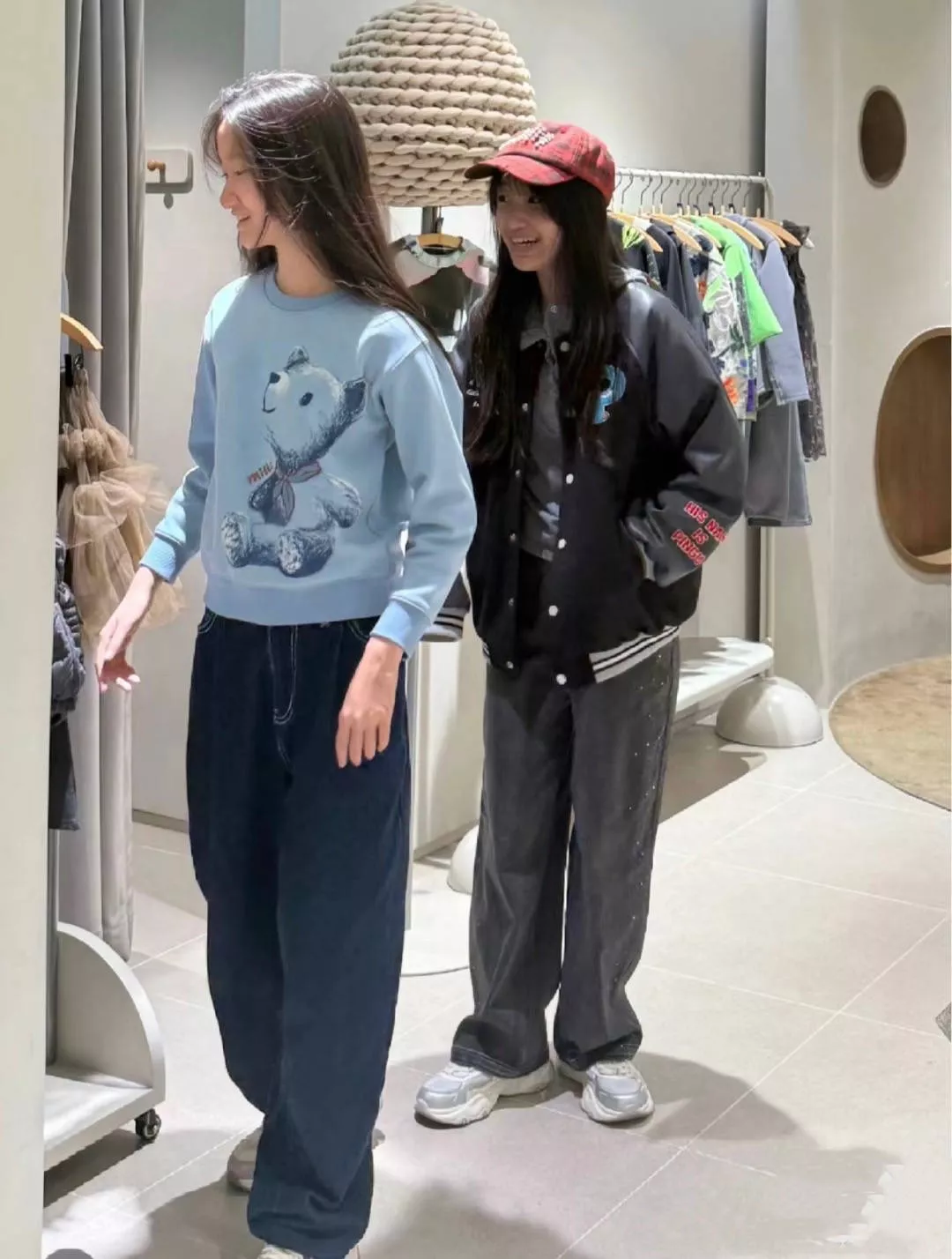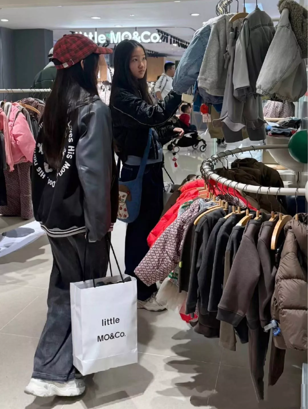 他们逛的是MO&Co的店铺,很平价的一个品牌、衣服款式也符合年轻人的审美。姐姐火星穿蓝色毛衣看着很文静,妹妹穿夹克外套很俏皮。