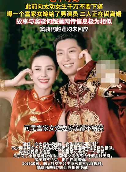 搜狐也娱乐讯 近日,向太陈岚发布视频称“女生千万不要下嫁”,不少网友称向太分享的故事与窦骁何超莲网传信息极为相似。向太在视频中透露:“一个富家女嫁给了一个演员,几乎花了全部家当办婚礼,富家女这边不给任何金钱支持,房子都不给买。他们在闹离婚。”10月20日,向太多个社交平台主页已看不见该视频。关于故事与窦骁何超莲网传信息极为相似一事,窦骁何超莲均未回应。