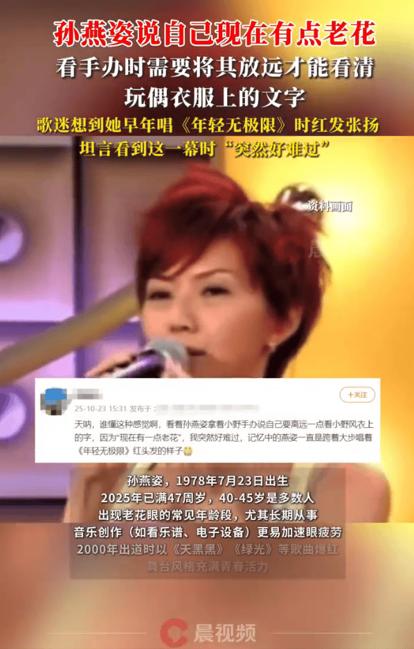 孙燕姿,1978年7月23日出生,2025年已满47周岁,40-45岁是多数人出现老花眼的常见年龄段,尤其长期从事音乐创作(如看乐谱、电子设备)更易加速眼疲劳。