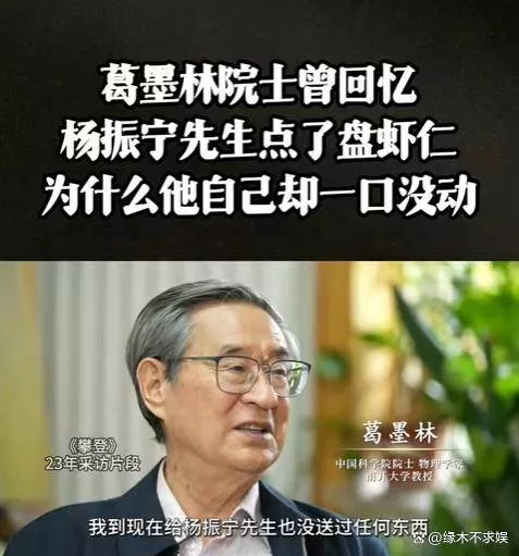葛墨林院士还提及他眼中的杨振宁,为人温和体贴。两人同桌用餐时,点了一盘虾,杨振宁从未动筷,葛墨林误以为他不吃虾,后来才明白杨振宁是特意让给他自己吃。每每回忆此事,葛墨林院士感慨万分,称杨振宁虽是大人物,却待身边人如亲人。