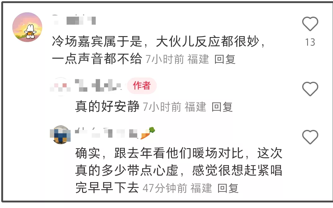 据多位现场观众反馈,郁采真们的表演堪称是冷场嘉宾,上台后大家的反应都很微妙,没有给任何欢呼声音或者戏谑声音,大家都安安静静看她们表演,跟去年的暖场氛围两模两样。从现场返图来看,台上歌手们劲歌热舞,观众们的表情都很冷漠,并没有跟随旋律有任何律动,也不怪有观众表示表演者流露出心虚,有一种赶紧唱完就撤的局促感。
