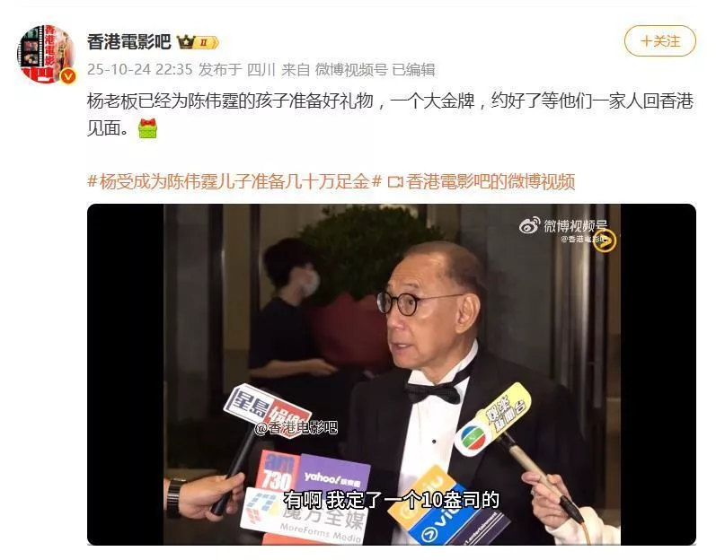 10月24日与妻子陆小曼的结婚40周年晚宴上,容祖儿、阿Sa、阿娇、关智斌等群星云集,而老板杨受成却在接受采访时,主动爆料了这份重磅礼物——一块重达10安士(约311克)的足金金牌。按当前金价估算,价值高达几十万人民币,他计划在陈伟霆夫妇带儿子回港时亲手送上。