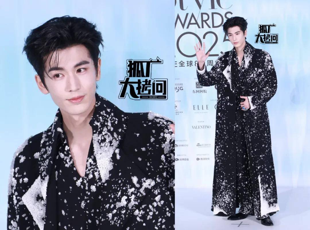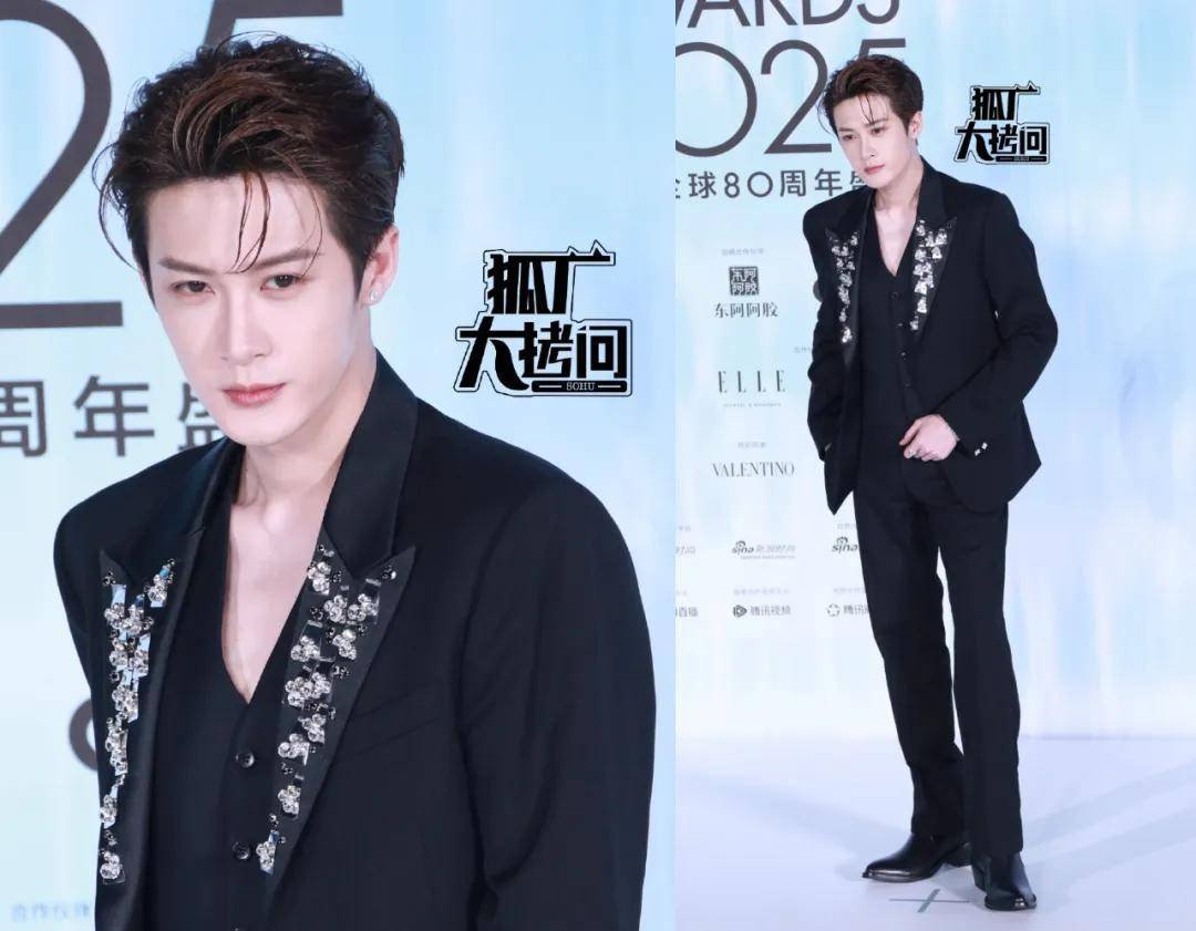 张凌赫最近几次的红毯造型都偏保守和安全,帅气但不够出彩。这次他身着黑色雪花套装,就像一个帅气的秀场模特。