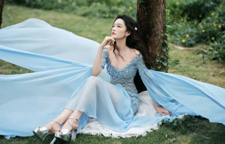 这次团队总算没有延续“微商”风,而是给她选择了蓝色高开叉低胸礼服。