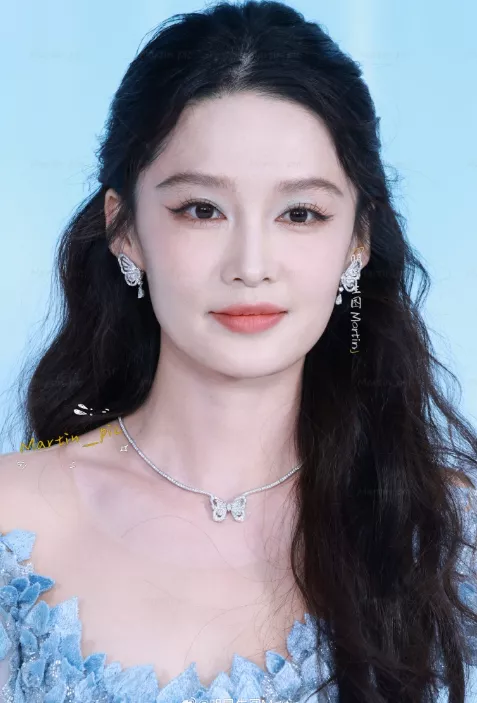 这次选择的香槟蕾丝礼服配粉色毛绒披帛,镜头拉近确实有点惊艳。