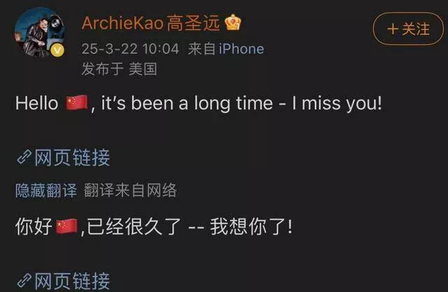 今年3月份倒是在微博上用英语发了一段博文,称中国我想你了。