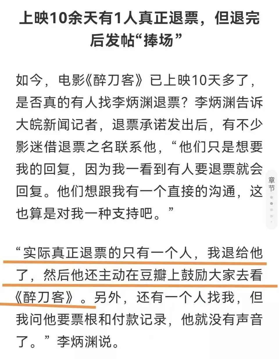 最讽刺的是导演李炳渊近日接受记者采访的时候说,到目前为止,已经有一名影迷成功退票了。他在退票之后,还在豆瓣发帖为电影“捧场”。